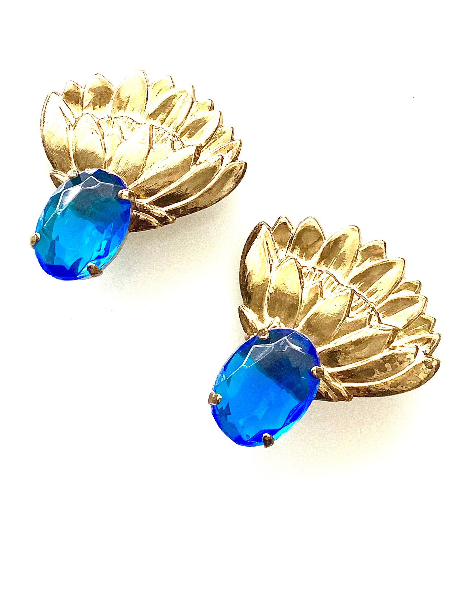 stunning, gold tone fan style earrings with blue jewel detailing.