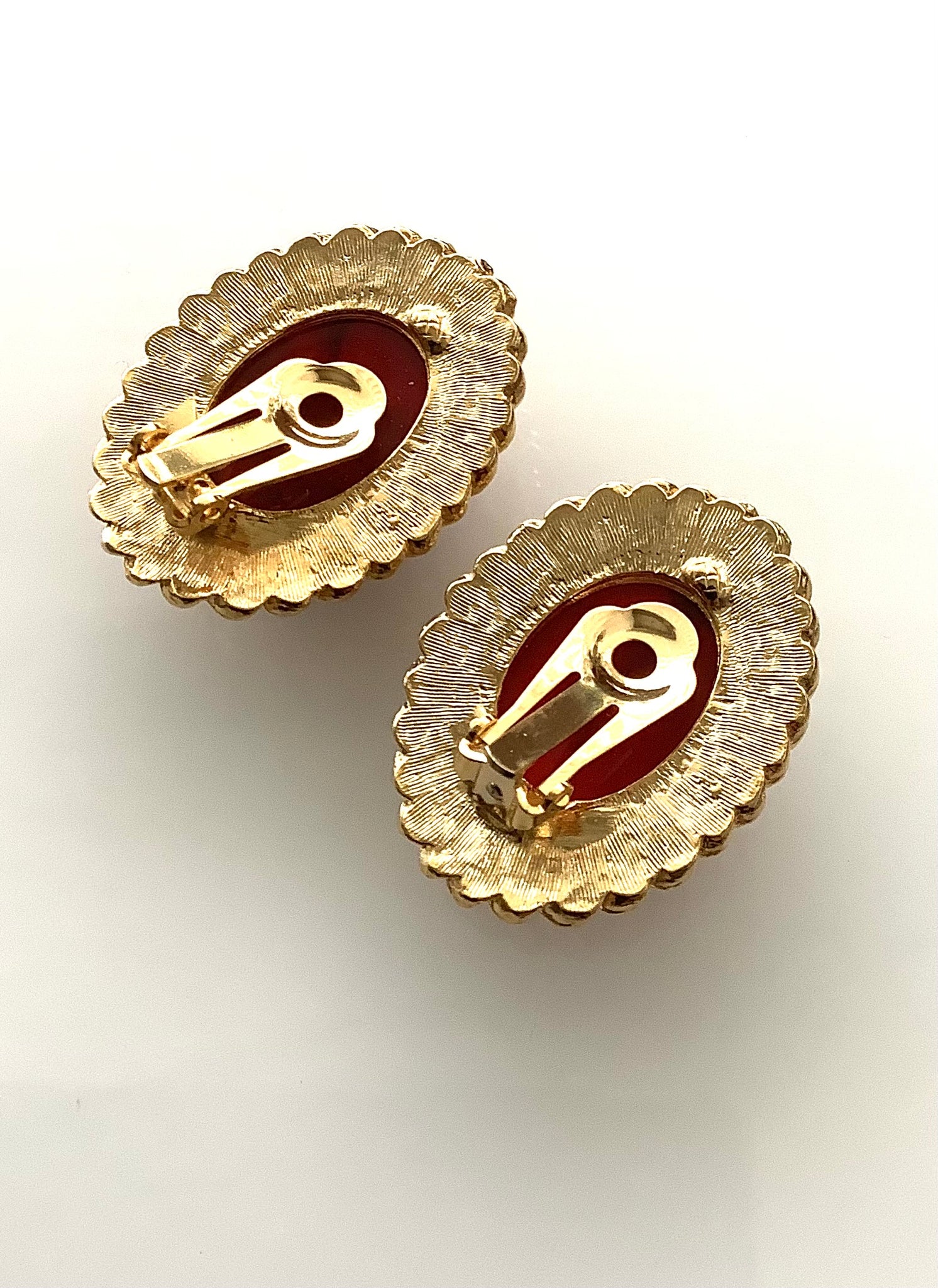 Vintage, clip on, red marbled effect earrings with gold plated surround.