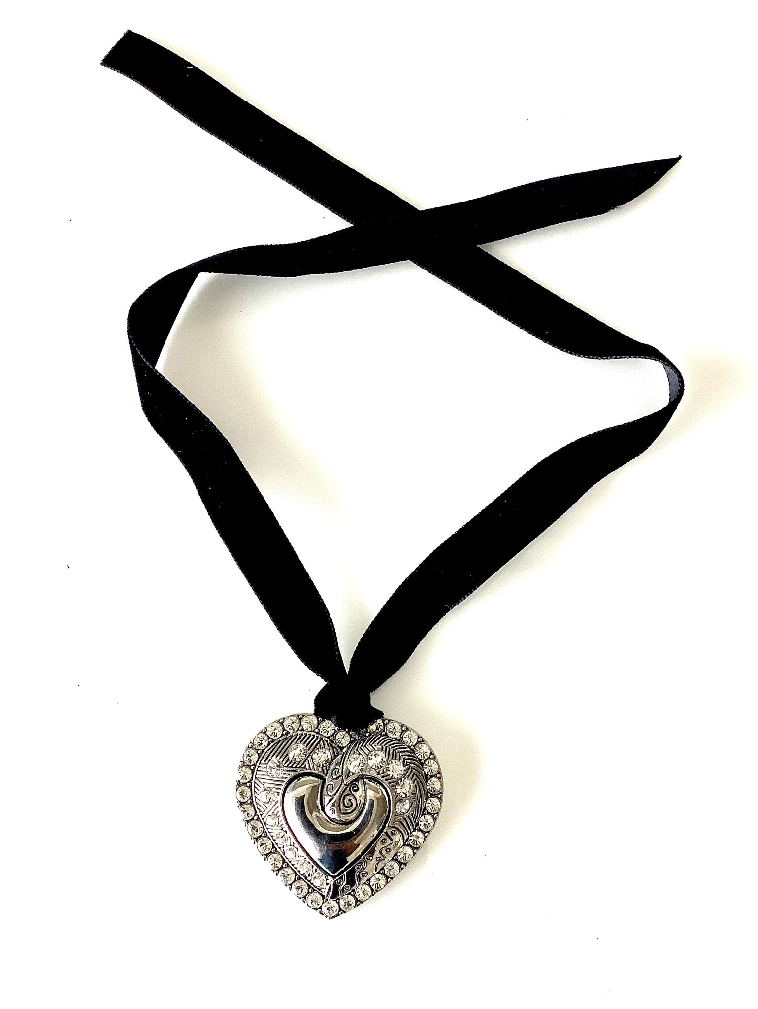 Black velvet ribbon choker with large silver tone and crystal jewelled heart pendant.