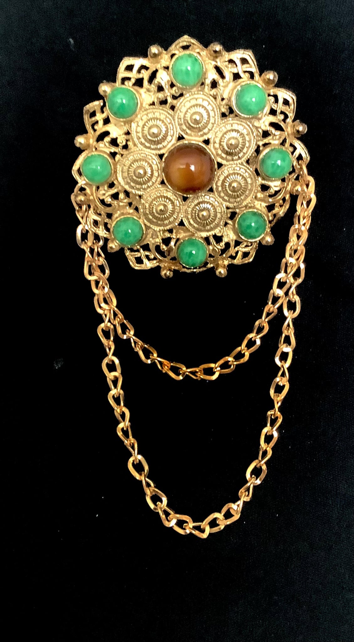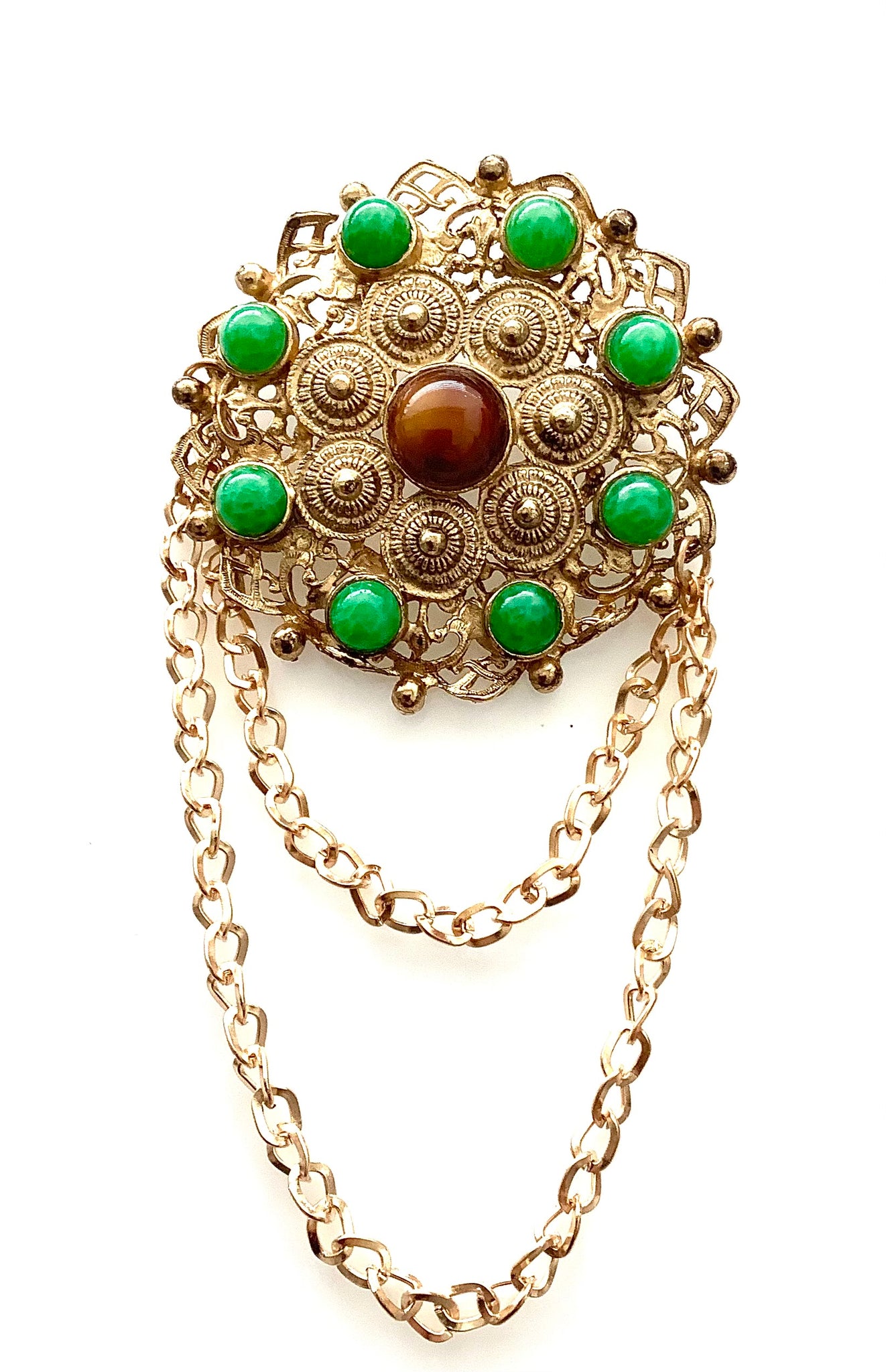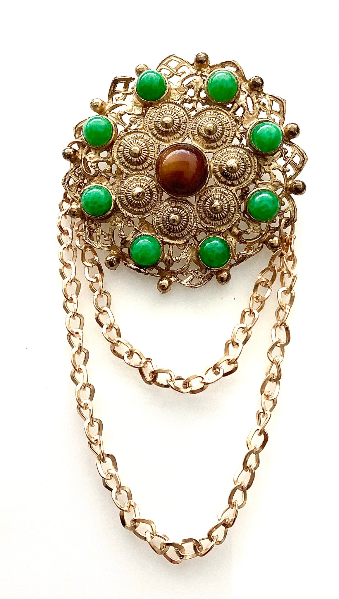 Antique gold tone, Baroque style brooch with green and brown acrylic gems and gold tone chain detailing.