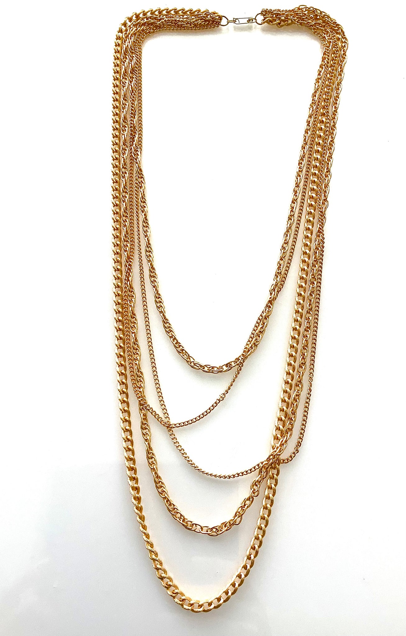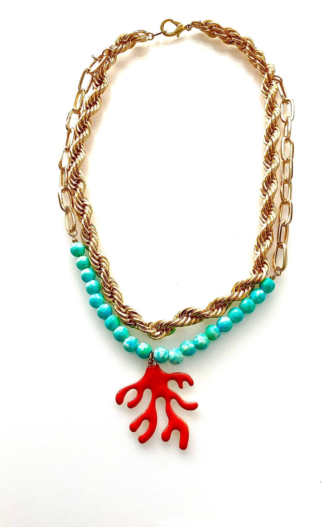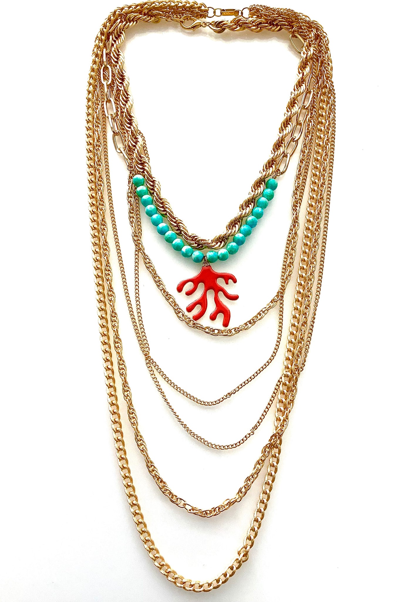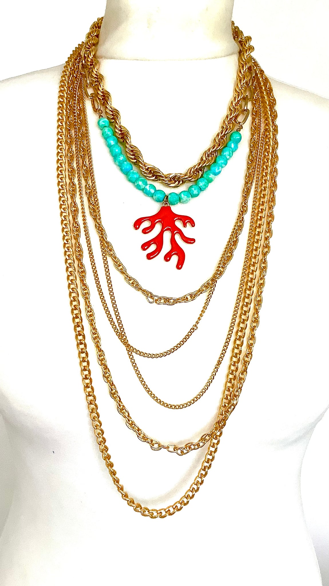 Multi layered, long gold tone chain necklace with chunky turquoise bead and coral coloured pendant necklace.