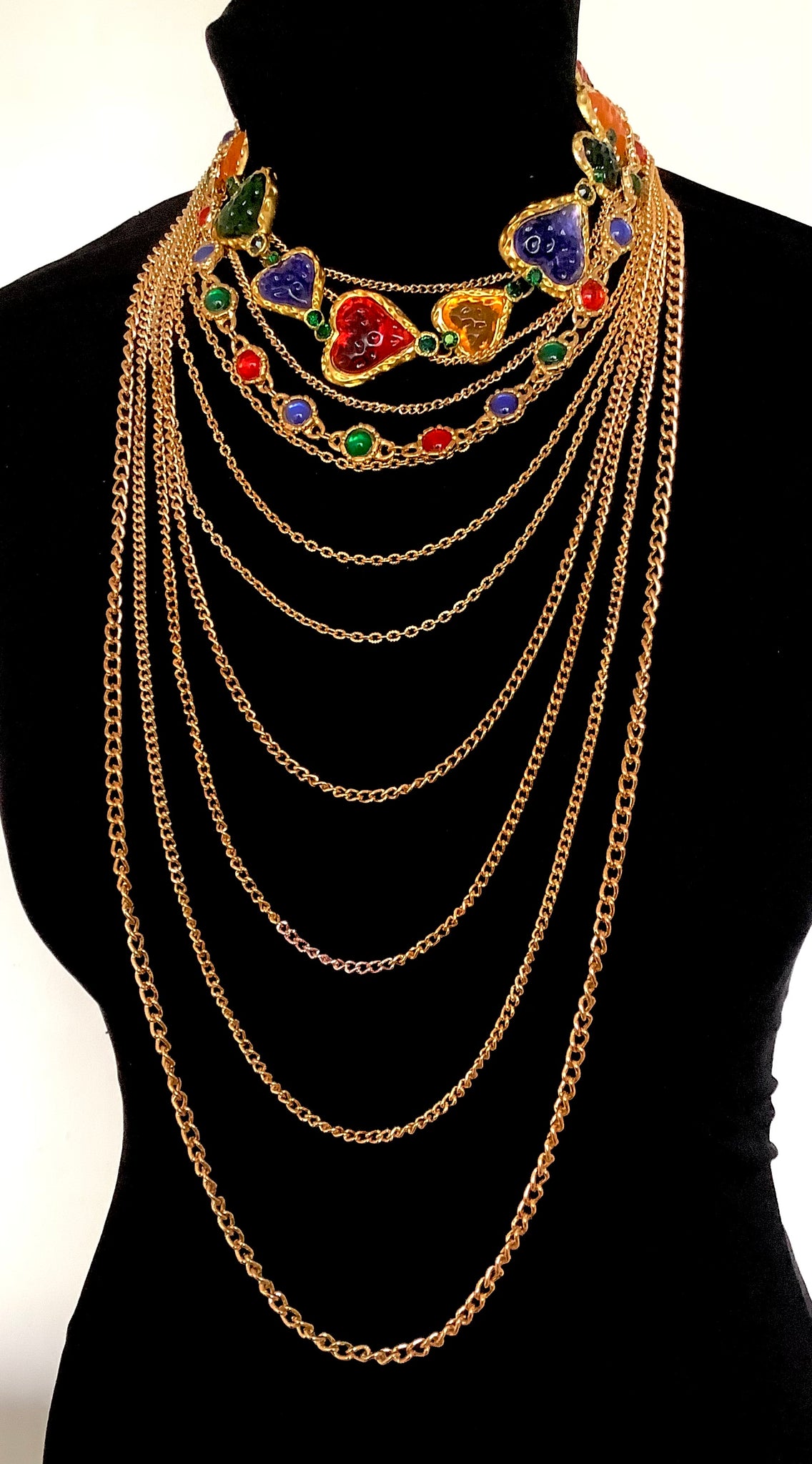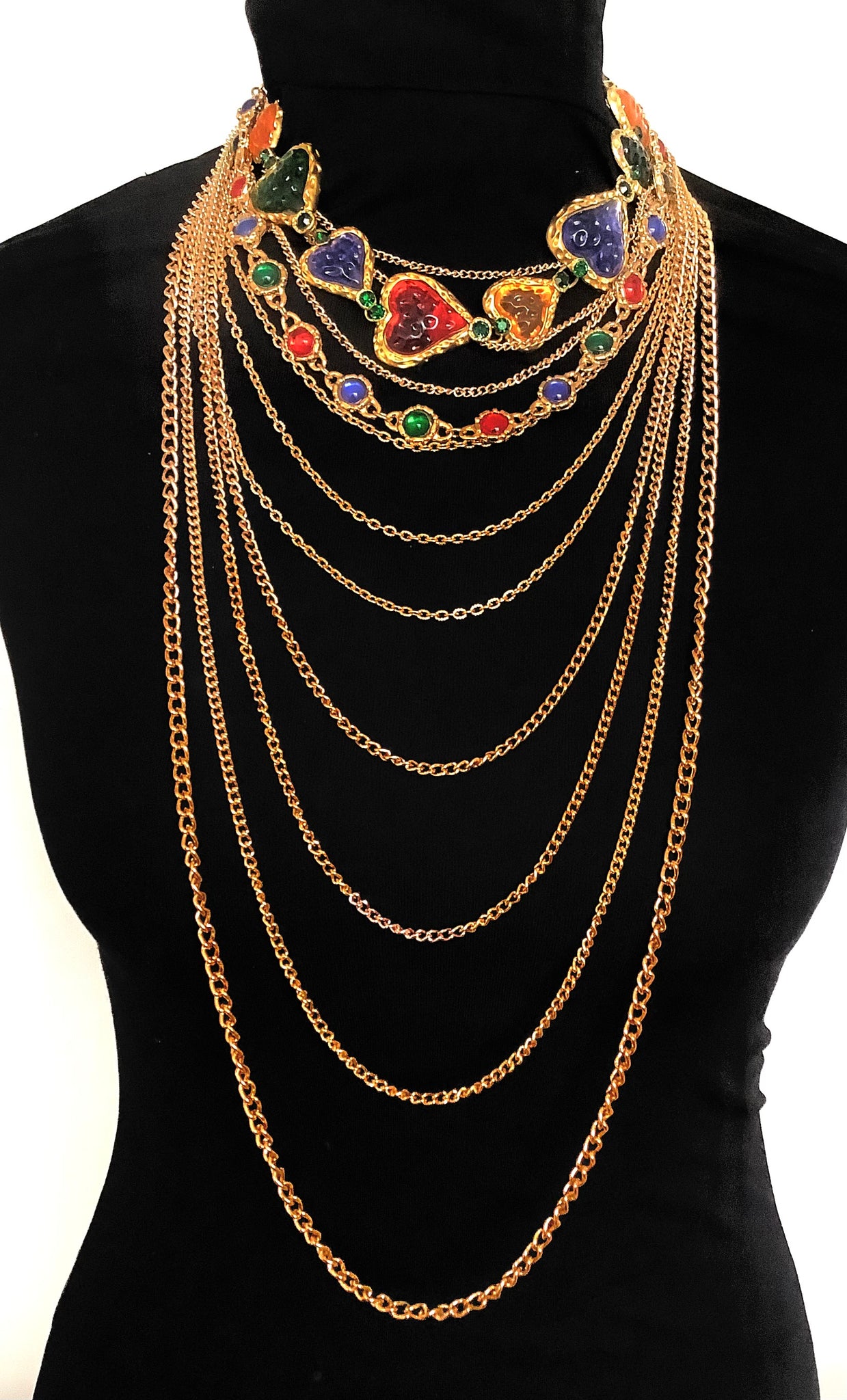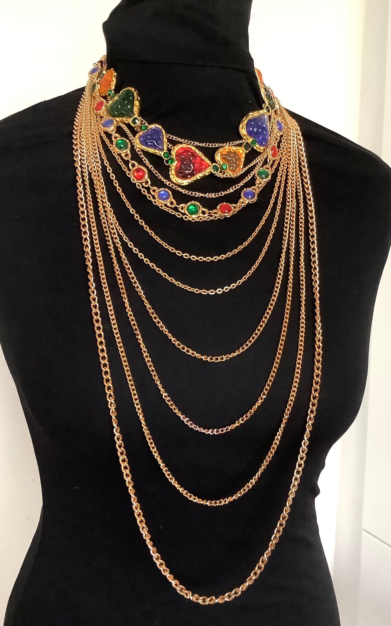 Multi layered, long gold tone chain necklace and a double row multi coloured jewelled necklace.