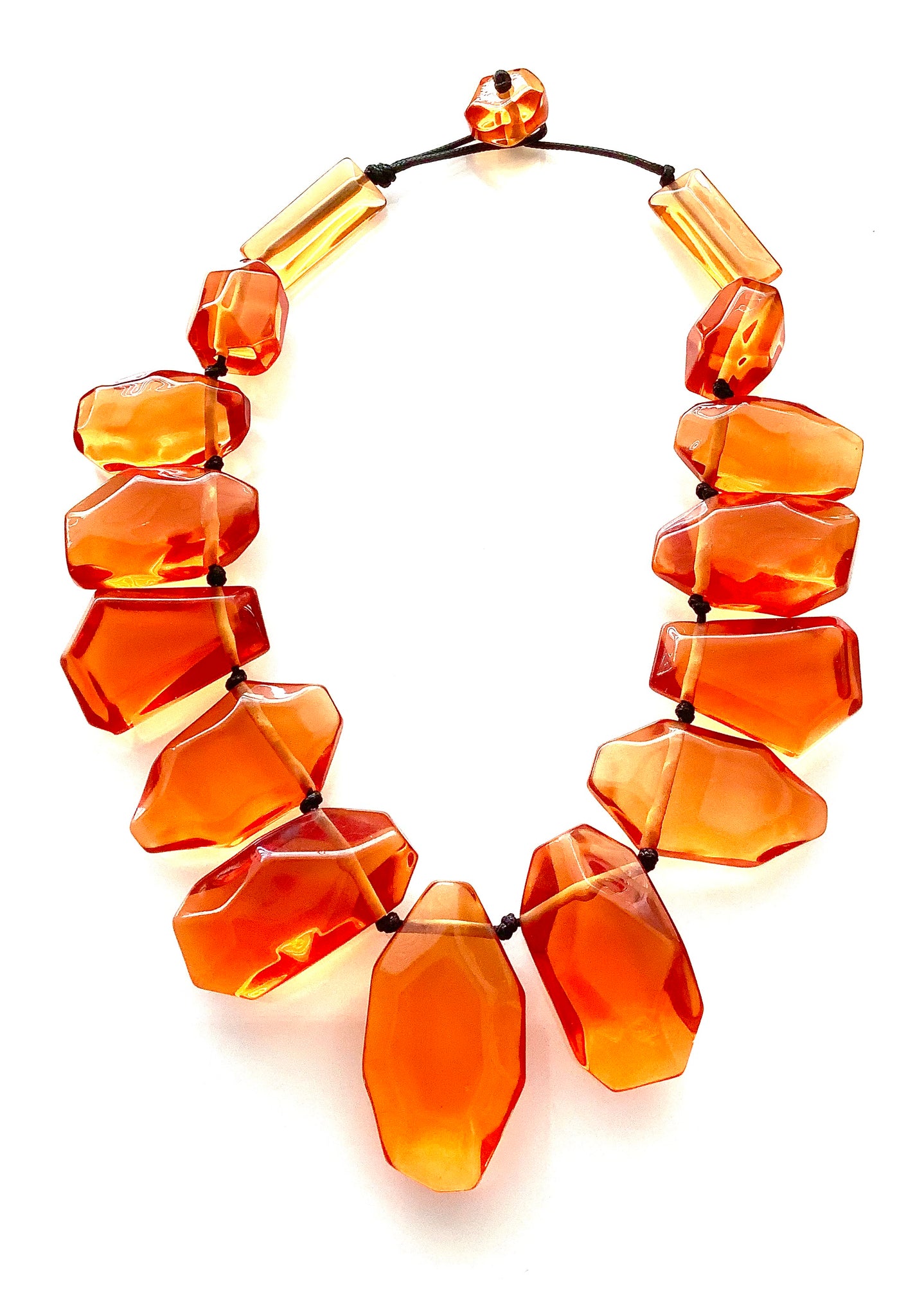 Chunky, orange transparent, acrylic abstract style bead necklace.