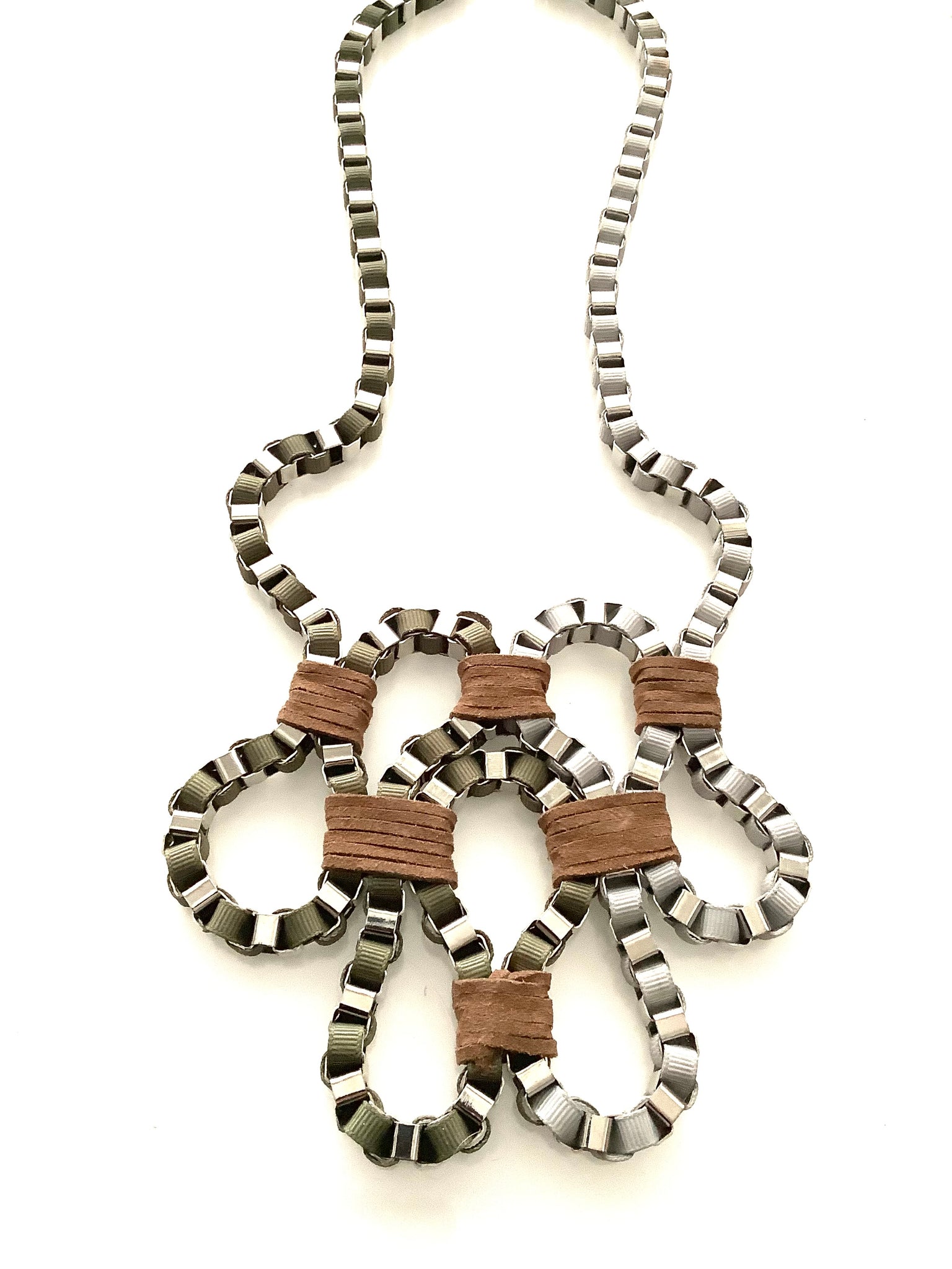 Silver tone, articulated chain, geometric style necklace with grey and brown interwoven fabric detailing.