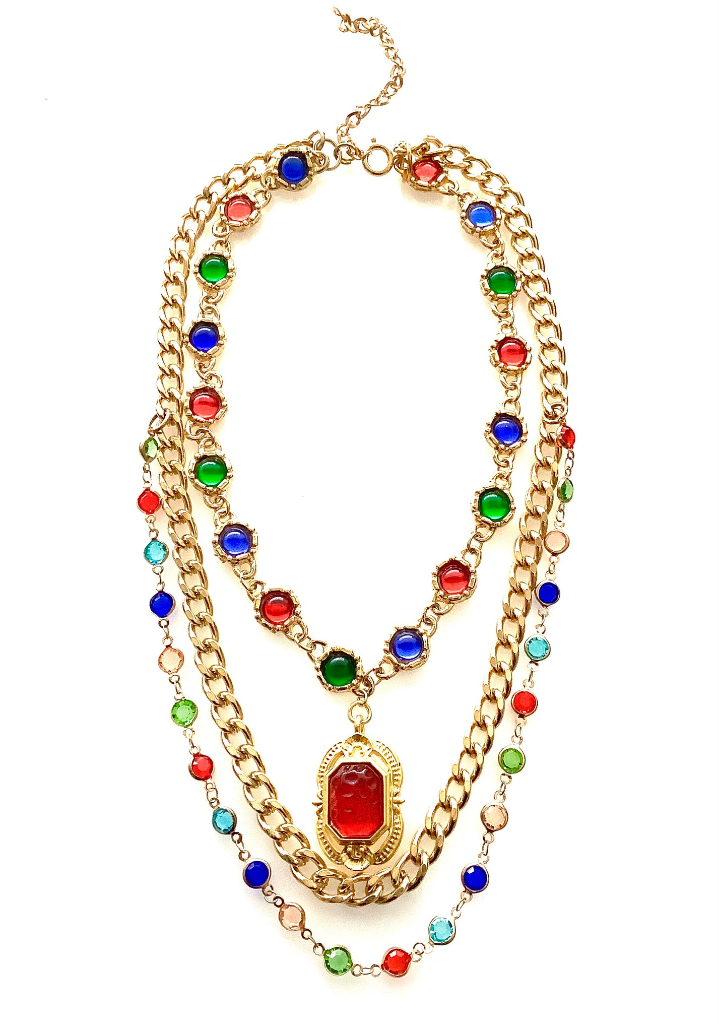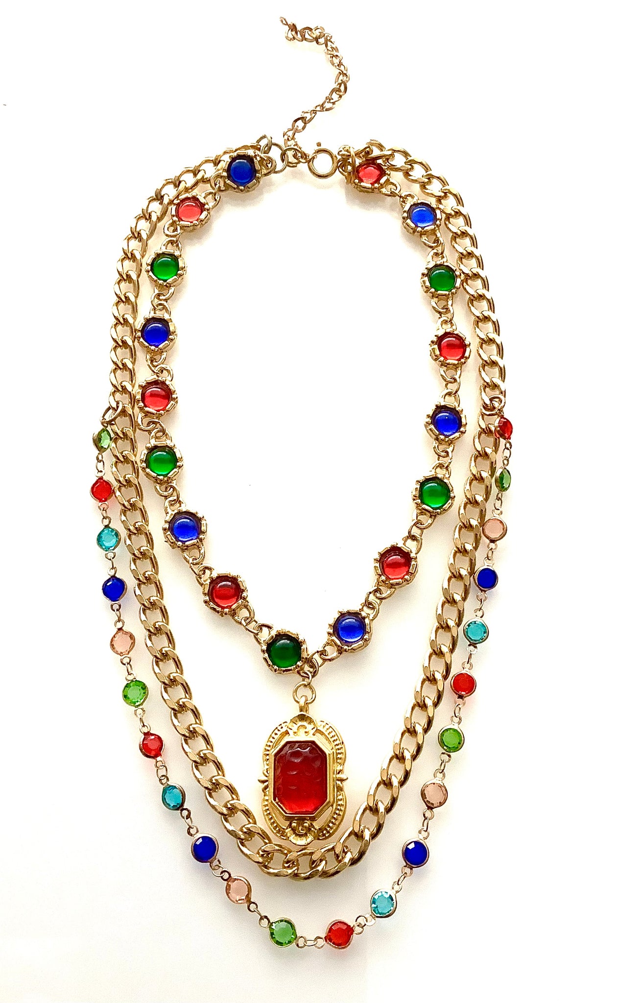 Layered design, gold tone chain and vintage multi-coloured jewelled necklace.